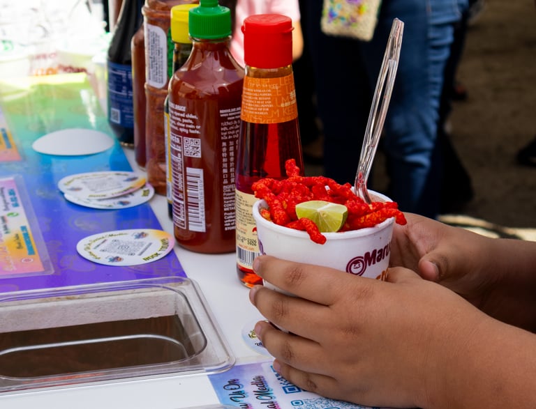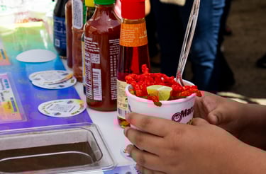 We offer mini pancake bars, tostilocos, maruchan, esquites, and chocolate fountain tables.